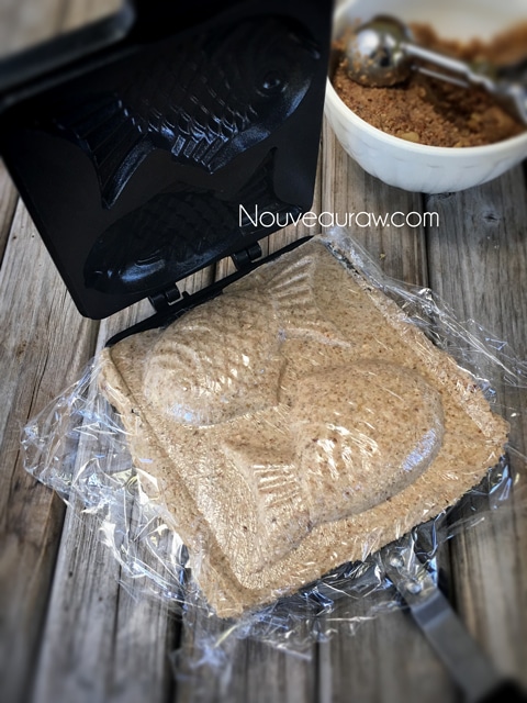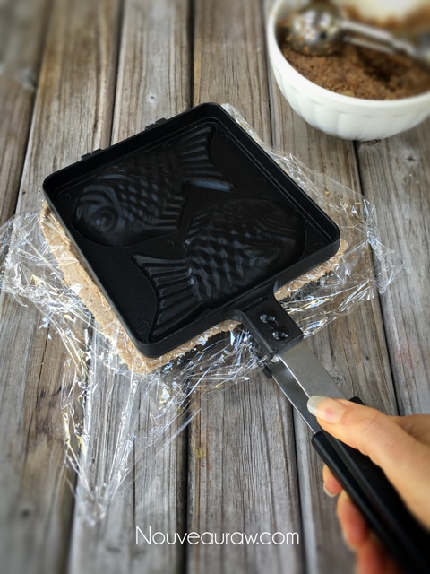 - Prepare the fish mold by lining it with plastic wrap. This will help with removal. I tried without, and boy was it a mess. :P
